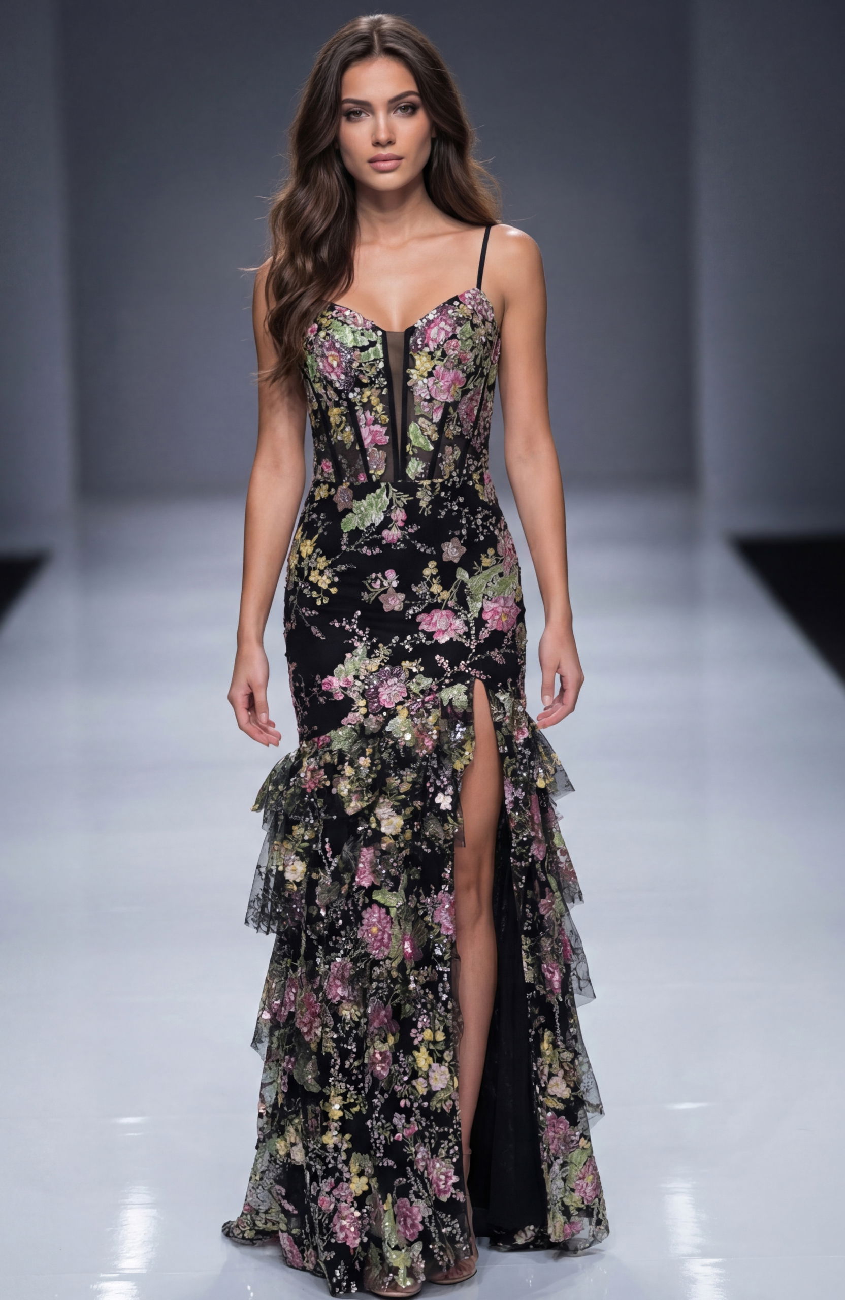 This captivating dress features delicate spaghetti straps, complemented by a sheer insert that adds a touch of allure. The corset bodice, adorned with intricate beads, provides a structured and flattering fit. The dress is crafted with ruffled details and a bold floral print, exuding femininity and charm. A daring slit enhances its sophisticated appeal. The back zipper closure ensures a seamless finish, while the floor-length skirt flows in a sheath silhouette, ending with a dramatic train, making this dress perfect for any formal event.